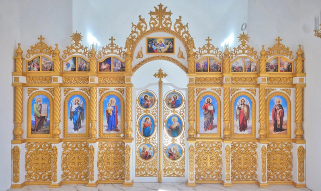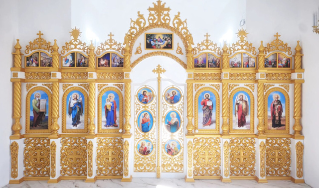 Цей іконостас виконаний у класичному православному стилі з багатою декоративною різьбою та позолотою.
